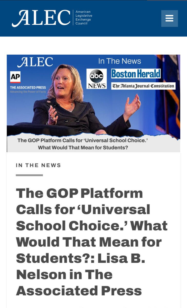 The American Legislative Exchange Council is also funded by Devos and Koch and strongly supports school choice. ALEC funds expensive trips where lawmakers leave with model, ready-to-pass legislation in hand. ALEC has received funding from the Koch network and American Federation for Children.